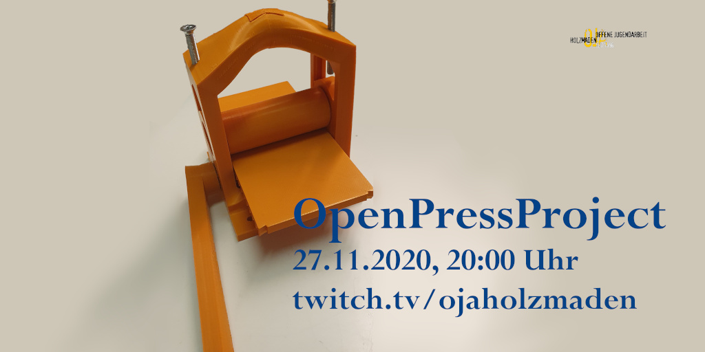 Der Workshop wird über Twitch gestreamt: https://www.twitch.tv/ojaholzmaden und ist offen jeden. Weitere Informationen zum "Open Press Projekt" und die 3D Druckdateien kann man unter https://openpressproject.com/ finden.